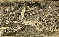 A separate tradition holds that the Ganda are the descendants of a people who came from the east or northeast around 1300.[7] According to the traditions chronicled by Sir Apolo Kagwa, Buganda's foremost ethnographer, Kintu was the first Muganda, and having descended to Earth at Podi is said to have moved on to Kibiro, and having reached Kyadondo in Uganda's modern-day Wakiso District have formed Buganda there.