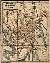 The town was known in antiquity as Vicus Aquensis[3] (Latin for "watery neighborhood") and in the Middle Ages as Aquae Convenarum[4][5] ("Waters of the Comminges"). Its present name similarly means "Baths" (Occitan: Banheras) of Bigorre, the area of southwestern France once inhabited by the Bigorri and now forming most of the department of Hautes-Pyrénées. Either Bagnères-de-Bigorre or nearby Cieutat was apparently the "Begorra" attested in AD 400, which also derived from the ancient tribe.[6]