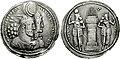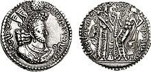 Several coin types were minted during Bahram II's reign; one type imitates him alone; another with him and a female figure; a third one with Bahram II and an unbearded youngster wearing a high tiara (known as a Median bonnet); and a fourth one shows Bahram II with the female figure and the unbearded youngster all together.[9][32][33] The female figure is wearing different headdress on some of the coins, sometimes with a boar, griffin, horse or eagle.[34] The precise meaning of these variations is unclear.[34]