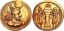 Starting with Bahram II, all the Sasanian shahs are portrayed with earrings on their coins.[28] He is the first shah to have wings on his crown, which refers to the wings of the god's bird, Verethragna.[29] Like his predecessors (with the exception of Ardashir I and Shapur I, whose legends were slightly different), Bahram II's legend on his coinage was "the Mazda-worshiping, divine Bahram, King of Kings of Iran(ians) and non-Iran(ians), whose image/brilliance is from the gods."[30][31][a]