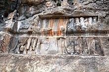 A sixth relief, portraying an equestrian combat, was carved directly below the tomb of the Achaemenid King of Kings Darius the Great (r. 522–486 BCE).[9] The relief has two panels. The top panel depicts Bahram II's war against Carus, which he claims as a victory. The lower panel depicts Bahram II's war with Hormizd I Kushanshah.[9][16] A seventh relief, at Tang-e (or Sarab-e) Qandil, depicts a divine investiture scene, with Bahram II receiving a flower from Anahita.[38] Bahram II also erected two rock reliefs in Barm-e Delak: the first depicts Bahram II giving a flower to Shapurdukhtak; the second depicts Bahram II making gesture of piety, whilst being offered a diadem by a courtier.[38]