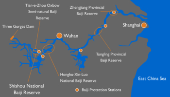 Since 1992 five protected areas of the Yangtze have been designated as baiji reserves. Four were built in the main Yangtze channel where baiji are actively protected and fishing is banned: two national reserves (Shishou City and Xin-Luo) and two provincial (Tongling and Zhenjiang). A fifth protected area is an isolated oxbow lake located off of the north bank of the river near to Shishou City: the Tian-e-Zhou Oxbow Semi-natural Reserve. Combined, these five reserves cover just over 350 kilometres (220 mi), about 1/3 of the baijis range, leaving two-thirds of the species' habitat unprotected.[12]