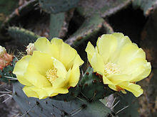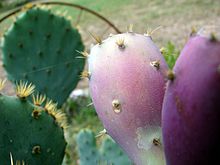 Opuntia, commonly called prickly pear, is a genus of flowering plants in the cactus family Cactaceae.[1] Prickly pears are also known as tuna (fruit), sabra, nopal (paddle, plural nopales) from the Nahuatl word nōpalli for the pads, or nostle, from the Nahuatl word nōchtli for the fruit; or paddle cactus. The genus is named for the Ancient Greek city of Opus, where, according to Theophrastus, an edible plant grew and could be propagated by rooting its leaves.[2] The most common culinary species is the Indian fig opuntia (O. ficus-indica).