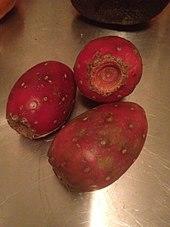 The fruit of prickly pears, commonly called cactus fruit, cactus fig, Indian[13] fig, nopales[14] or tuna in Spanish,[15] is edible, although it must be peeled carefully to remove the small spines on the outer skin before consumption. If the outer layer is not properly removed, glochids can be ingested, causing discomfort of the throat, lips, and tongue, as the small spines are easily lodged in the skin. Native Americans like the Tequesta would roll the fruit around in a suitable medium (e.g. grit) to "sand" off the glochids. Alternatively, rotating the fruit in the flame of a campfire or torch has been used to remove the glochids. Today, parthenocarpic (seedless) cultivars are also available.