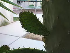 O. ficus-indica is a large, trunk-forming, segmented cactus that may grow to 5–7 m (16–23 ft) with a crown of over 3 m (10 ft) in diameter and a trunk diameter of 1 m (1 yd).[1] Cladodes (large pads) are green to blue-green, bearing few spines up to 2.5 cm (1 in) or may be spineless.[1] Prickly pears typically grow with flat, rounded cladodes (also called platyclades) containing large, smooth, fixed spines and small, hairlike prickles called glochids that readily adhere to skin or hair, then detach from the plant. The flowers are typically large, axillary, solitary, bisexual, and epiperigynous, with a perianth consisting of distinct, spirally arranged tepals and a hypanthium. The stamens are numerous and in spiral or whorled clusters, and the gynoecium has numerous inferior ovaries per carpel. Placentation is parietal, and the fruit is a berry with arillate seeds. Prickly pear species can vary greatly in habit; most are shrubs, but some, such as Opuntia echios of the Galápagos, are trees.