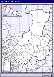 Bajura District (Nepali: बाजुरा जिल्ला ), a part of Sudurpashchim Province, is one of the seventy-seven districts of Nepal. The district, with Martadi (today part of Badimalika municipality) as its district headquarters, covers an area of 2,188 km2 (845 sq mi) and had a population of 108,781 in 2001[2] and 134,912 in 2011.[1] The district has nine municipalities, 9 Ilakas and 1 constituency areas. The district is situated in Longitude between 81° 10′ 20″ to 81° 48′ 27″ East and Latitude 29° 16′ 21″ to 29° 56′ 56″ North. Geographically the district is divided in three distinct regions from north to south viz. Higher Himalayan Region, Higher Mountain and mid – Mountains. The Higher Himalayan region comprises Saipal Himalayan range; High Mountain region comprises Doha Lekh and Ghori Lekh. Similarly, Mid-Mountain range comprises different ranges of mountains e.g. Badimalika Temple. The District has started from 300m to 6400m in height. The annual rainfall is about 13,433 mm and temperatures vary from 0 °C to 40 °C. The livelihood of more than 80% of the district population depends on agriculture farming, mainly small scale livestock. Due to low level of agricultural production, the majority of the households face acute food shortages for a large part of the year. According to the National Census 2011, the total population of the district is 134,912 comprising 69,106 female (51%) and 65,806 male (49%) residing in 24,908 households. Bajura district has an average population density of around 62 people per square km. The average family size is 5.4. Life expectancy of the people is 58 years. The average literacy rate is about 32%. Bajura district has a multi ethnic composition with Chhetri, Kami, Thakuri, Brahman, Damai, SarkI and Sanyashi (Giri and Puri). The common language is Nepali (96%) followed by Bhote Sherpa (0.46%) and Tamang (0.42%). Although accessibility to Bajura is very poor, this is improving rapidly. The Government strategy is mainly focused on the connection of VDC headquarters with all-weather motor able roads to SRN or District headquarters. Moreover, the DDC body of Bajura district has given higher priority on rural roads.