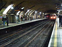 The final section is the deep-level tube station of the Baker Street & Waterloo Railway (now part of the Bakerloo line), situated at a lower level beneath the site of Baker Street East, opened on 10 March 1906.[66] This part of the station now contains four platforms which are used by both the Bakerloo and Jubilee lines.[67]