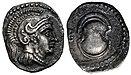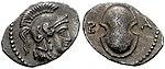 Coin of Balakros, Satrap of Cilicia, with letter "B" next to the shield, standing for B[AΛAKPOI].[1] Tarsos. 333-323 BC. | |