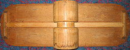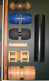 The roller has a different form in different models. Some are a cylinder and some are a cylinder in their midsection that tapers toward the two ends. That tapering enables tricky moves by the rider. Four of the models produced by Vew-Do Balance Boards [13] each have a roller whose shape has a different taper, designed for doing different tricks and simulating different boardsports. (One of those four is the roller at the top of the photograph to the side of this paragraph.) Vew-Do's patent gives information about the effect that its roller's shape has on the board's movement.[14]