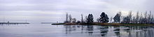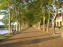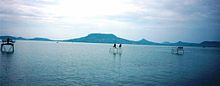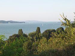 Balatonföldvár was beautified with an impressive promenade bordered by a double row of plane trees along the western part of the town. The view of the north shore is breathtaking. Standing on the western pier, one can see a number of conical hills on the other side, and the flat, table like mountain of Badacsony, a famous wine-producing area. The hills of the Tihany peninsula appear much closer. The lower slopes of these dark treed hills are covered with the purple haze of flowering lavender fields during the summer season.