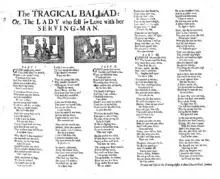 Broadside ballads (also known as 'broadsheet', 'stall', 'vulgar' or 'come all ye' ballads) were a product of the development of cheap print in the 16th century. They were generally printed on one side of a medium to large sheet of poor quality paper. In the first half of the 17th century, they were printed in black-letter or gothic type and included multiple, eye-catching illustrations, a popular tune title, as well as an alluring poem.[23] By the 18th century, they were printed in white letter or roman type and often without much decoration (as well as tune title). These later sheets could include many individual songs, which would be cut apart and sold individually as "slip songs." Alternatively, they might be folded to make small cheap books or "chapbooks" which often drew on ballad stories.[24] They were produced in huge numbers, with over 400,000 being sold in England annually by the 1660s.[25] Tessa Watt estimates the number of copies sold may have been in the millions.[26] Many were sold by travelling chapmen in city streets or at fairs.[27] The subject matter varied from what has been defined as the traditional ballad, although many traditional ballads were printed as broadsides. Among the topics were love, marriage, religion, drinking-songs, legends, and early journalism, which included disasters, political events and signs, wonders and prodigies.[28]
