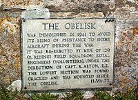 The obelisk at Ballard Down commemorates the provision of a new supply of drinking water for Swanage in 1883. It was taken down in 1941 as it was a landmark that might have aided enemy aircraft during World War II, but was re-erected in 1952.