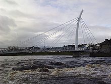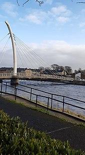 The Salmon Weir Bridge is a pedestrian bridge over the River Moy from Barrett St. to Ridge Pool Rd. The bridge, which was designed to resemble a fishing rod, was opened in July 2009.