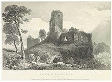 The keep is 45 to 50 feet (14 to 15 m) high. The ground floor is vaulted and originally had no entrance to it except by a trap door from above. The room on the first floor had a path up to it, carried on arches. It is about 7.5 by 9 feet (2.3 by 2.7 m). A very narrow staircase leads to other stories, all of which have stone floors on solid arches.[5] To support them, the two walls on which they rest are thicker than the others. The second story has seats in the lambs of the loopholes, a drain from a garderobe (lavatory) and a small square cupboard in the wall over it.[5] The upper floor and chief chamber seems to have had windows added on all sides in the middle of the 19th century. There are loopholes in other parts of the walls of the keep.[13] The lack of windows and a fireplace, and the fact that the small rooms occupied all the internal space between the walls, suggests that the building was more of a keep for last defence than regular living quarters.