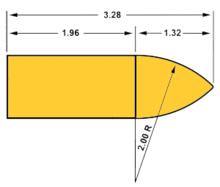 The general form for the calculations of trajectory adopted for the G model is the Siacci method. The standard model projectile is a "fictitious projectile" used as the mathematical basis for the calculation of actual projectile's trajectory when an initial velocity is known. The G1 model projectile adopted is in dimensionless measures of 2 caliber radius ogival-head and 3.28 caliber in length. By calculation this leaves the body length 1.96 caliber and head, 1.32 caliber long.[32][10]