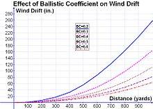 In ballistics, the ballistic coefficient (BC) of a body is a measure of its ability to overcome air resistance in flight.[1] It is inversely proportional to the negative acceleration: a high number indicates a low negative acceleration—the drag on the body is small in proportion to its mass. BC can be expressed with the units kilogram per square meter (kg/m2) or mass pound per square inch (lbs/in2)[2] (where 1 lbs/in2 corresponds to 703.069581 kg/m2).