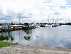 Just located off the main street on the shore lies the Marina Complex, which plays host to the local community centre, bar, boat berthing yard, boat slipways and a harbour with 72 berths, a play park, and picnic areas, caravan/camping site and small forest.