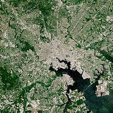 Baltimore (/ˈbɔːltɪmɔːr/ BAWL-tim-or, locally: /ˈbɔːlmər/) is the most populous city in the U.S. state of Maryland, as well as the 30th most populous city in the United States, with an estimated population of 593,490 in 2019. Baltimore is the largest independent city in the country and was designated as such by the Constitution of Maryland[10] in 1851. As of 2017, the population of the Baltimore metropolitan area was estimated to be just under 2.802 million, making it the 21st largest metropolitan area in the country.[11] Baltimore is located about 40 miles (64 km) northeast of Washington, D.C.,[12] making it a principal city in the Washington–Baltimore combined statistical area (CSA), the fourth-largest CSA in the nation, with a calculated 2018 population of 9,797,063.[13]