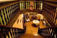 Ornate upper bronze balustrade, lower vasiform stone balustrade, and bronze central rail supported by decorative bronze metalwork at Brown University's Orwig Music Library