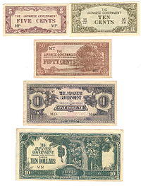 The Japanese government-issued dollar was a form of currency issued for use within the Imperial Japan-occupied territories of Singapore, Malaya, North Borneo, Sarawak and Brunei between 1942 and 1945. The currency was also referred to informally (and with more than a trace of contempt and derision) as banana money (Malay: duit pisang), named as such because of the motifs of banana trees on 10 dollar banknotes. The Japanese dollar was in widespread use within the occupied territories where the previous currency became scarce. The currency were referred to as "dollars" and "cents" like its predecessors, the Straits dollar, Malayan dollar, Sarawak dollar and British North Borneo dollar.