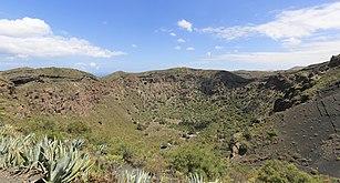 The bottom of the caldera contains volcanic ash of different colors, and some botanic species of Canary Islands origin.