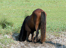 Fresh water is a limiting resource for Bankers, as the islands are surrounded by salt water and have no freshwater springs or permanent ponds.[16] The horses are dependent on ephemeral pools of rainwater and moisture in the vegetation they consume.[18] Bankers will dig shallow holes, ranging from 2.5 to 4 feet (0.76 to 1.22 m) in depth, to reach fresh groundwater.[16] Occasionally, they may resort to drinking seawater. This gives them a bloated appearance, a consequence of water retention caused by the body's effort to maintain osmotic balance.[20]