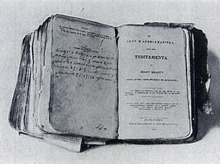 The first bilingual renderings of religious texts are those by Étienne de Flacourt,[20] who also published the first dictionary of the language.[21] Radama I, the first literate representative of the Merina monarchy, though extensively versed in the Arabico-Malagasy tradition,[22] opted in 1823 for a Latin system derived by David Jones and invited the Protestant London Missionary Society to establish schools and churches. The first book to be printed in Malagasy using Latin characters was the Bible, which was translated into Malagasy in 1835 by British Protestant missionaries working in the highlands area of Madagascar.[23]