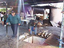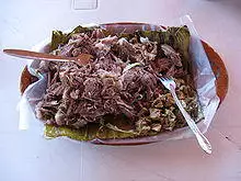 Barbacoa (Spanish: [baɾβaˈkoa] ) is a form of cooking meat that originated in the Arawak-speaking Caribbean with the Taíno people, from which the term "barbecue" derives.[1] In contemporary Mexico, it generally refers to meats or whole sheep or whole goats slow-cooked over an open fire or, more traditionally, in a hole dug in the ground covered with agave (maguey) leaves, although the interpretation is loose, and in the present day (and in some cases) may refer to meat steamed until tender. This meat is known for its high fat content and strong flavor, often accompanied with onions and cilantro (coriander leaf).