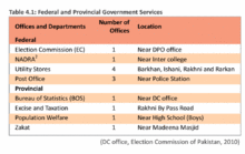 A number of Federal and Provincial Government departments provide services at the district level. Except for FBS, Civil Defense and Passport and immigration, all other major departments are functional at the district level, and some departments have offices even at the tehsil level. (DC office, Election Commission of Pakistan, 2010)