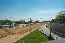 Decommissioned Interstate 695 began to be transformed into a boulevard named "Southeast Boulevard".[70] The reconstruction project, estimated to take 18 to 24 months, raised the roadway 20 feet (6.1 m) to bring it level with the grade of the surrounding streets.[71] The six-lane former highway began to be turned into a four-lane grand boulevard with a landscaped median and pedestrian nature trail. Southeast Boulevard was designed to link Barney Circle to 11th Street SE.[70]