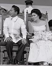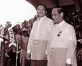 After the Philippines independence on 4 July 1946, Americana or a suit and tie continued to be the dominant formal wear, worn by presidents Manuel Roxas and Elpidio Quirino.[10] In 1953, however, President Ramón Magsaysay won the election by being "a man of the masses". He deliberately wore a barong tagalog at his inauguration. The press played up the symbolism of Magsaysay in a barong tagalog and the outgoing Quirino in a western-style suit as symbolic of the "break" between the independent Philippines and its colonial past. He also wore barong tagalog in most public and private state functions. Magsaysay's use of the barong tagalog as formal attire was unprecedented in modern times. His example was followed by other Philippine presidents, and by the time of Diosdado Macapagal's term in the 1960s, it had regained its status as formal wear. Ferdinand Marcos, in particular, wore barong tagalog at almost every occasion. In 1975, Marcos issued a decree for the barong tagalog, along with the baro't saya, to become the official national attire. June 5 to 11 was also declared as the "Barong Tagalog Week".[10][3][4][18]