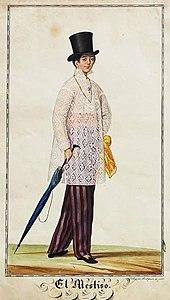 The first baro precursor to gain favor among the local and mestizo elites was the barong mahaba (literally "long baro") which became prominent starting from the 1820s. These were much longer than the modern barong tagalog, reaching down to slightly above the knees. They were also commonly striped with bold colors like blue, red, or green. However, they already displayed hallmarks of the modern barong tagalog, including being made of sheer nipis material, embroidery, long sleeves, and a loose silhouette with slits on both sides. However, they lacked buttons. Early examples of barong mahaba usually had high-standing collars or even Elizabethan-style ruffs with narrow cravats. Barong mahaba were generally worn with colorful straight-cut trousers with stripes, checkers, or plaid-like patterns (generally made from imported cambaya, rayadillo, and guingón fabrics), top hats (sombrero de copa), and a type of embroidered velvet or leather slip-on shoes known as corchos. While barong mahaba were generally worn loose, they were sometimes fastened by silk strings through three openings around the waist, either over or under the shirt. The sheer fabric used by barong mahaba also necessitated the wearing of an undershirt, known as camisón or camiseta, which was also worn on its own by commoners.[7][17]