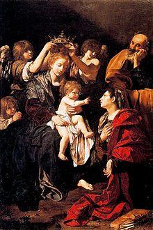In 1617 Giovanni Battista Crescenzi traveled to Spain to work in the Pantheon of the Escorial and in this period he was significant in defining artistic taste in the Madrid court.[8] Crescenzi brought Cavarozzi with him to Spain where they worked for approximately two years. The paintings Cavarozzi produced in Spain show Caravaggio's use of naturalistic figures in raking light and darkness however, he developed a distinguishing style of his own, which among other things was less inclined toward drama and leaning more to tender and reserved figures. The Holy Family with Saint Catherine of Alexandria (1618) in the Prado Museum, Madrid dates from Cavarozzi's time in Spain.[3]