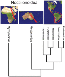 - While the bat superfamily Noctilionoidea has over 200 species in the Neotropics, two in New Zealand, and two in Madagascar, the basal position of the Malagasy family[34] suggests, in combination with the fossil record and the next-most-basal placement of the New Zealand family, that the superfamily originated in Africa and then migrated eastward to South America, proliferating there but surviving in the Old World only in refugia.[35]