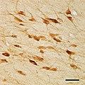 Intermediate magnification micrograph of the nucleus basalis. LFB-HE stain. | |