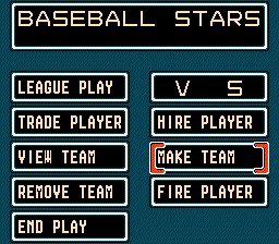 Baseball Stars includes a simple one-off versus mode, but it provides the option of creating a mini-league of up to six teams, with each team playing up to 25 games against every other team. That means a season with a maximum 125 game schedule can be created. When making a season, one chooses how many teams, how many games, and which teams are controlled by the AI (computer) and which are controlled by the gamers. In vs. mode, no stats, such as wins, losses, hits, or home runs are kept but money can still be won when a player controlled team plays against an AI-controlled team. No money is won in this mode when it is player vs. player. Versus mode games can be considered exhibition games.