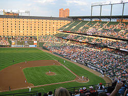 - Oriole Park at Camden Yards (Baltimore Orioles) – Camden Yards is the park that began the retro ballpark craze (although the minor-league Sahlen Field in Buffalo, designed by the same firm, predates Camden Yards by four years). Its green seats, its brick and steel finish, and its irregular grandstand configuration all hearken back to the good ol' days. Beyond the bleachers in right and right center is a wall of brick columns with black iron gates. Beyond that looms the large B&O Warehouse, a very prominent feature of the park.