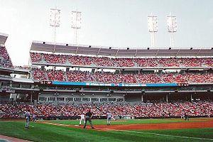 - Great American Ball Park (Cincinnati Reds) – Sitting on the Ohio River, the park has the same relationship to the water that Oracle and PNC have. Beyond the right-center fence sits two large steamboat smokestacks that belch smoke, flash lights, and shoot fireworks when the Reds hit a home run and win games. The most prominent feature is a large gap in the grandstand. As the outfield is towards the river, and away from downtown Cincinnati, there is a large gap in the grandstands that allows a view of the city from the park and vice versa. To one side of the gap, there are three seating levels, and on the other, there are two. Inside the park, there are Italian-marble mosaics, "toothbrush" light towers, and the nostalgic Sun/Moon Deck. The contemporary-looking, glass-wrapped facade around the exterior is the first of the retro era.