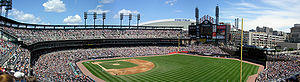 - Comerica Park (Detroit Tigers) – Two brick walls flank the batter's eye, the names of those important to the organization and the Tigers' retired numbers painted in white on them. Above the left field wall, Comerica has its own monument park filled with large statues of Tiger greats. Over the left field upper deck, one can see Ford Field looming, which was built in the same project as the park. The scoreboard is topped by two large tigers, and, whenever a run is scored, their eyes light up and the sound of a tiger growl is played over the speakers. Beyond the outfield is a great view of downtown Detroit, including the Wyland Whale mural, although this has been periodically covered with a Verizon ad since the 2006 postseason. Since downtown is located south of the stadium, this orientation unfortunately gives the majority of spectators in left field an eyeful of sunlight as the sun sets. The park started its life with an extremely deep left-center field, but the fence has since been moved in with the bullpen now occupying the previously in-play area. The left-center field flagpole was originally in-play before this fence was brought in prior to the 2003 season. The field itself is graced by a distinctive dirt strip between home plate and the pitching mound. Once uniformly common in early baseball parks, Comerica Park is the only Major League park to feature a strip.[29]