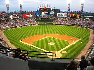 - Guaranteed Rate Field (Chicago White Sox) – The old Comiskey Park was well known for what was called the "Exploding Scoreboard". This scoreboard was reincarnated in the new park. Holding a huge video screen, the scoreboard features sound effects and fireworks that go off after wins and home runs and is topped by iconic spinning pinwheels.