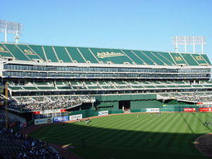 - Oakland Coliseum (Oakland Athletics) – The Coliseum is dominated by a section of seating derisively known as "Mount Davis". To lure the Raiders football team from Los Angeles back to Oakland, seats needed to be added to satisfy owner Al Davis. Thus, the 6-floor seating area was added, blocking the view of the hills beyond. The Coliseum is also known for its immense foul territory, which results in many popped-up foul balls that would go well into the seats in other stadiums being easily caught for outs.