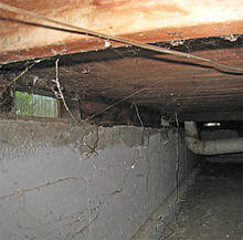 Modern crawl space thinking has reconsidered the usage of crawl space vents in the home.[8][9] While crawl space vents do allow outside air to ventilate into the home, the ability of that air to dry out the crawl space is debatable.[10] In areas with humid summers, during the summer months, the air vented into a crawl space will be humid, and as it enters the crawl space, which has been cooled naturally by the earth, the relative humidity of the air will rise. In those cases, crawl space vents can even increase the humidity level of a crawl space and lead to condensation on cool surfaces within, such as metal and wood.[11] In the winter, crawl space vents should be shut off entirely, to keep out the cold winter air which can cool hot water pipes, furnaces, and water heaters stored within. During rainy weather, crawl space vents bring wet air into the crawl space, which will not dry the space effectively.