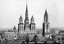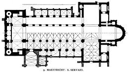 The present-day church is probably the fourth church that was built on the site of the grave of Saint Servatius, an Armenian missionary who was bishop of Tongeren and died allegedly in 384 in Maastricht.[1] A small memorial chapel on the saint's grave was replaced by a large stone church built by bishop Monulph around 570. This church was replaced by a larger pilgrim church in the late 7th century, which was then replaced by the present-day structure, which was built in several stages over a period of more than 100 years. The nave was built in the first half of the 11th century, the transept in the second half of the century, and the choir and westwork in the 12th century. The Romanesque church was built during a period in which the chapter of Saint Servatius kept close ties to the Holy Roman Emperors, which resulted in a building that has the characteristics of a German imperial church. The dedication of the church in 1039 was attended by the emperor Henry III and twelve bishops. Most of the church's Medieval provosts were sons of the highest ranking German noble families. Several held the office of chancellor of the German Empire; at least eight provosts went on to become archbishops.[2]