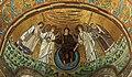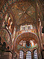 The central section is surrounded by two superposed ambulatories. The upper one, the matrimoneum, was possibly reserved for married women. A series of mosaics in the lunettes above the triforia depict sacrifices from the Old Testament:[7] the story of Abraham and Melchizedek, and the Sacrifice of Isaac; the story of Moses and the Burning Bush, Jeremiah and Isaiah, representatives of the twelve tribes of Israel, and the story of Abel and Cain. A pair of angels, holding a medallion with a cross, crowns each lunette. On the side walls the corners, next to the mullioned windows, have mosaics of the Four Evangelists, under their symbols (angel, lion, ox and eagle), and dressed in white. Especially the portrayal of the lion is remarkable in its ferocity.