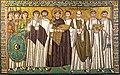 At the foot of the apse side walls are two famous mosaic panels, completed in 547. On the right is a mosaic depicting the East Roman Emperor Justinian I, clad in Tyrian purple with a golden halo, standing next to court officials, Bishop Maximian, palatinae guards and deacons. The halo around his head gives him the same aspect as Christ in the dome of the apse, but is part of the tradition of rendering the imperial family with haloes described by Ernst Kantorowicz in The King's Two Bodies. Justinian himself stands in the middle, with soldiers on his right and clergy on his left, emphasizing that Justinian is the leader of both church and state of his empire. The later insertion of the Bishop Maximian's name above his head suggests that the mosaic may have been modified in 547, replacing the representation of the prior bishop with that of Maximian's.