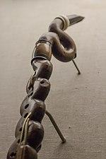 There are several instruments that can arguably be considered the first bass clarinet. Probably the earliest is a dulcian-shaped instrument in the Museum Carolino Augusteum in Salzburg. It is incomplete, lacking a crook or mouthpiece, and appears to date from the first half of the eighteenth century. Its wide cylindrical bore and its fingering suggest it was a chalumeau or clarinet in the bass range.[11] Four anonymous bass chalumeaux or clarinets apparently dating from the eighteenth century and having from one to six keys also appear to be among the earliest examples, and one in particular has been suggested to date from before 1750.[12] However, the authenticity of at least one of these instruments has been questioned.[13]