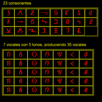 Vah is a true alphabet, with 23 consonant letters, 7 vowel letters, and 5 tone diacritics, which are placed inside the vowels. It also has its own marks for commas and periods.