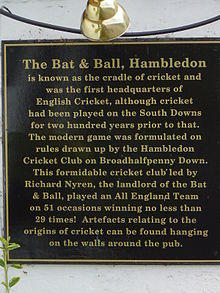 The Bat & Ball Inn near Clanfield, Hampshire, England, is an historic eighteenth century pub situated opposite the Broadhalfpenny Down cricket ground, the original home of the Hambledon Club. It is traditionally, though erroneously, called "the cradle of cricket". The pub is currently owned by Fuller's and is a former George Gale and Co Ltd Pub.