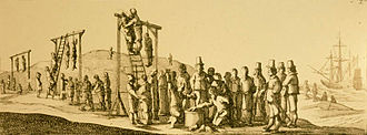 Pelsaert decided to conduct a trial on the islands, because the Saardam on the return voyage to Batavia would have been overcrowded with survivors and prisoners. After a brief trial, the worst offenders were taken to Seal Island and executed. Cornelisz and several of the major mutineers had both hands chopped off before being hanged.[4] Wouter Loos and a cabin boy, considered only minor offenders, were marooned on mainland Australia, never to be heard of again. Reports of unusually light-skinned Aborigines in the area by later British settlers have been suggested as evidence that the two men might have been adopted into a local Aboriginal clan. Some amongst the Amangu people of the mainland have a blood group specific to Leyden, in Holland.[5] However, numerous other European shipwreck survivors, such as those from the wreck of the Zuytdorp in the same region in 1712, may also have had such contact with indigenous inhabitants.