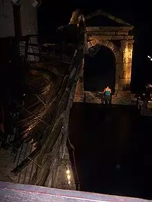 In order to facilitate the monitoring and any future treatment, the hull timbers were erected on a steel frame designed and erected by Geoff Kimpton, a member of Green's staff. The design, and that of a stone arch, or portico, which was also raised from the seabed, is such that individual components can be removed for treatment without affecting those adjacent, or the exhibit as a whole.[8]